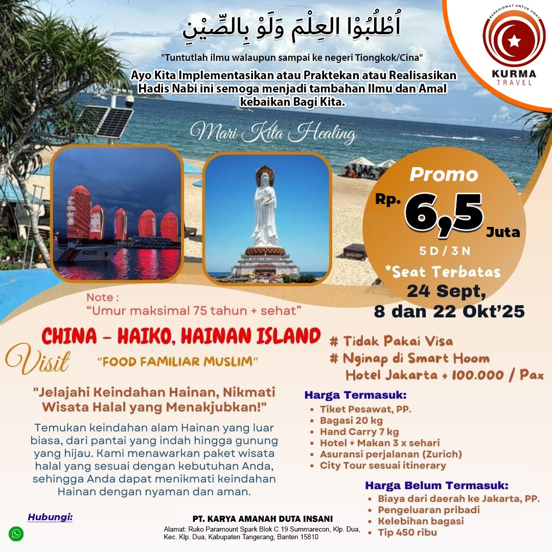 Nikmati keindahan Pulau Hainan, destinasi tropis yang dikenal sebagai “Hawaii-nya China”, dengan pemandangan alam yang memukau dan budaya yang unik. Paket eksklusif 6H4M ini dirancang untuk kenyamanan Anda selama menjelajahi kota-kota indah seperti Haikou, Sanya, dan Boao.
